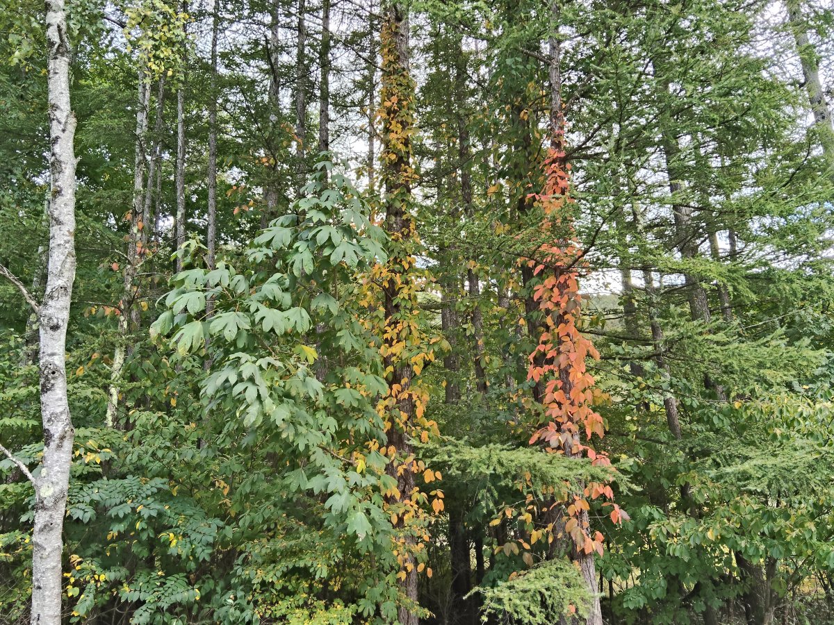 インフォメーションセンターから休暇村へ向かう途中、ひと際オレンジのツタウルシ。(かぶれます)