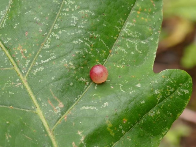 ナラハヒラタマルタマフシは、 通常、葉脈の中心(中脈)についていますが、ときどき支脈についているものもあります。